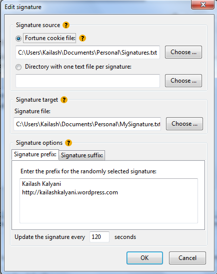 Your signature source can be of two types, a fortune cookie file or a directory that contains text files, each with a signature. The directory bit is easy, you just take your signatures and store them into individual text files and point the tool to that directory.