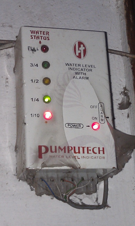 We’re connected to public water works in Delhi, but the way it works is that the Delhi Jal Board supplies water twice a day in our area. As of yesterday that was from 5:30 am through 7:30 am and from 6:00 pm through 7:30 pm, daily. During those times our water pump goes on and water gets pumped up to a storage tank (approx. 1000 Liters) and this tank then sources water to our apartment. When Geeta spoke of low water pressure, that meant our tank was close to empty and had been for a while! The last time I had to get the tank cleaned, it took me 3 days of great abandon to finish a 1/4 tank and that had been hard work. So, empty meant that the pump had not turned on for a few days and we’d failed to notice.