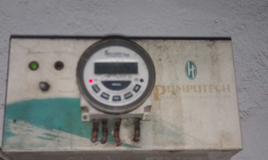we ascertained that the timer was at fault. The timer noted that power needed to be directed towards the pump, but the voltage on the wires was at zero. The timer guru would be available tomorrow around 10 am at the earliest. We did the jugaad thing and I dug up an extension cable and we spliced a new plug into the pump wires.