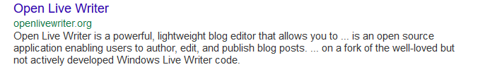 But looking at the list, I half considered installing one of the apps listed – but then decided to check up on what was available in the open source world. And lo and behold, my eyes were drawn to the open live writer (OLW) result:
